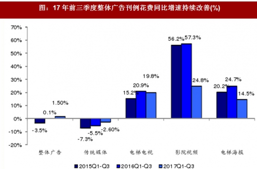 图:17年前三季度整体广告刊例花费同比增速持续改善(%)