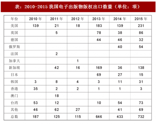 加入wto以来,我国电子出版物金沙下载送彩金的版权出口发展加快,增幅明显提升。据国家统计局数据显示,从2010年到2015年,我国电子出版物金沙下载送彩金的版权出口逐年增长。如表1所示,2015年我国电子出版物金沙下载送彩金的版权出口总数732项,出口到美国和新加坡的金沙下载送彩金的版权占总金沙下载送彩金的版权数的50.4%。其中,2010年至2015年,出口到美国的金沙下载送彩金的版权数量从139项增加到231项,涨幅39.8%;出口到新加坡的金沙下载送彩金的版权数量从42项增加到138项,增幅69.6%;出口金沙下载送彩金的版权的总数从187项到732项,增长幅度74.5%。另外,出口金沙下载送彩金的版权新兴发展的国家有德国、日本和俄罗斯,分别从之前没有金沙下载送彩金的版权出口到2015年金沙下载送彩金的版权出口分别达到32、15和54项。可见,我国电子出版物金沙下载送彩金的版权出口趋于增长态势,已成为世界电子出版物金沙下载送彩金的版权出口快速增长国之一。