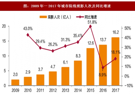 观影人次增长为一大亮点。2017年全国城市院线观影人次16.2亿同比增长18.1%,增速较上年明显提升。总人口人均观影次数为1.17,首次突破1次。长期来看,我国人均观影人次对比韩国人均3.5次、美国人均3.8次,依然有3倍渗透空间。