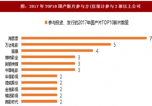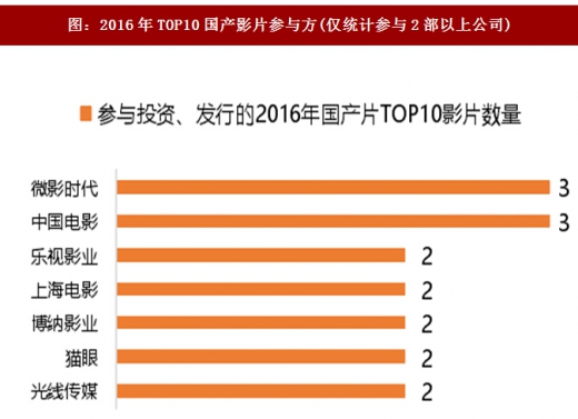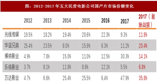 从国内传统五大民营电影公司市场份额看(参与制作发行口径统计),2017年五家公司市场份额波动较大,剔除《战狼2》的影响来看,万达影业17年参与出品多部丁op影片如《西游伏妖篇》《羞羞的铁拳》,市场份额从16年底部反弹;华谊兄弟凭借《西游伏妖篇》《芳华》两部电影取得20.4%市场份额,参与批片《摔跤吧,爸爸》表现突出;博纳影业市场份额14.1%。光线传媒17年自身参与影片成绩平淡,但公司参股的新丽传媒(《羞羞的铁拳》《妖猫传》)、猫眼(top10国产片参与4部,主控发行《羞羞的铁拳》)表现优秀;乐视影业17年影片较少,市场份额居后。