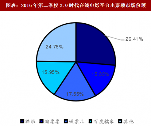 随着2013年美团电影更名为猫眼电影,以及2014年淘宝电影、微影时代的成立,在线电影平台进入2.0时代。bat等互联网巨头开始利用资本和流量优势,迅速瓜分在线票务市场,推动行业内合并。这一阶段市场高速发展,行业竞争加剧,有bat股东背景的微票儿、淘宝电影、百度糯米以及起步较早的猫眼电影凭借资本优势逐渐脱颖而出,形成四分天下的格局。