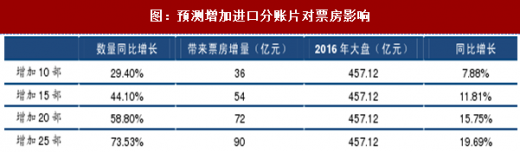 4种情形,分别是分账片增加10部、15部、20部以及25部。根据对上映电影数量以及影片单片票房的估计,我们认为2018年电影票房会有36-90亿的增量,相较于2016年电影票房同比增长约7.88%-19.69%。