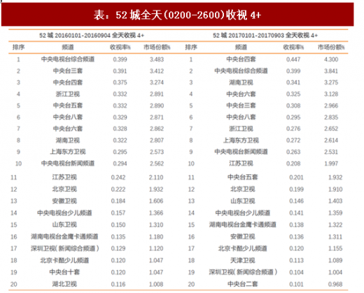 我们对比了2017年1~9月与2016年1~9月的csm52收视率数据发现,2017年前8名电视台市场份额总和为25.461%,与2016年24.49%相比,市场集中度基本持平;2017年前8名电视台收视率总和为2.66%,与2016年2.81%相比有所下降,电视台的观众在进一步的流失。