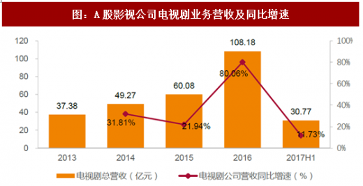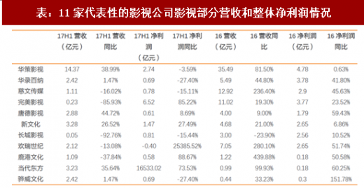 我们选取了a股11家具有代表性的公司,通过对其主营业务拆分。单看来自于影视剧营收,17h1数据合计达30.77亿元,同比增长11.73%。影视公司具有较强的季节性,大部分项目的确认将在q4,如受到季节性营销明显的有慈文传媒、完美影视、鹿港、欢瑞、骅威文化等。从2016年数据看,11家公司自于影视剧营收,16年合计达108亿元,同比增长80.06%。根据《影视蓝皮书2017》2016年电视剧、网大、网络剧合计市场空间为412亿,意味着这11家公司所涉及的项目(因为在全额法下,营收可能包含联合出品方的份额),占据了26%的空间。
