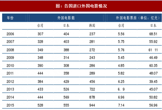 国际市场环境放开是大趋势。《关税与贸易总协定》和《服务贸易总协定》中均对电影业进出口做出了规定。纵观国际市场,加入wto使得台湾电影市场全面放开,每年是近400-500部进口电影;日本由“有限开放”到“无限开放”,每年约500部进口电影;韩国逐步放宽配额限制,每年约900部左右进口电影。而我国2014-2016年分别进口电影约为67部、62部、90部,相较于其他国家还有很大开放空间。电影市场的逐步放开在国际环境下是大趋势。