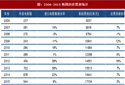 韩国:2011年到2012年,进口影片增加了167部,环比增长18%,当年票房增长7%;从2012年到2014年随着进口片数额的增加,韩国电影票房有较大幅度的增长率。