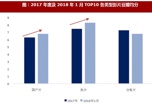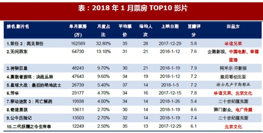 国产片口碑持续复苏、批片口碑依然亮眼,拉动票房市场。依然延续2017 年下半年国产片复苏行情,18 年1 月《前任3:再见前任》《无问西东》2 部国产影片月度票房占比高达45.9%,力压《勇敢者游戏:决战丛林》《星球大战:最后的绝地武士》《移动迷宫3:死亡解药》三部好莱坞大片;国产片口碑来看,月票房top10 中四部国产片豆瓣均分高达6.8 分,超过2016-17 年的5.8 分、6.3 分。批片口碑依然亮眼,1 月《神秘巨星》《奇迹男孩》两部批片豆瓣均分高达8.3,其中阿米尔汗力作《神秘巨星》进入月度票房top3。