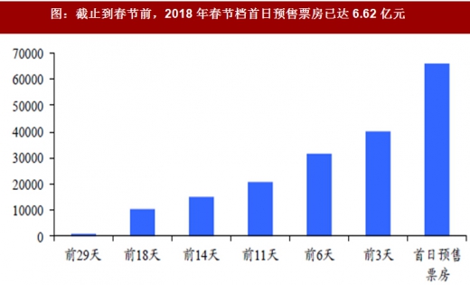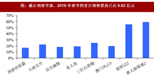 我们注意到2018年春节档的宣发和预售工作启动时间远早于以往年度,其中预售期始于春节前一个月,为历年最早,同时各个影片宣传方通过多样化的宣发手段实现了各自影片的广泛认知度,从而为春节档的票房,尤其是首日及次日票房爆发创造了基础。根据数据,截止到春节前,春节档首日预售票房累计达到6.62亿元,占春节档首日最终票房的53%,远超其余年份。