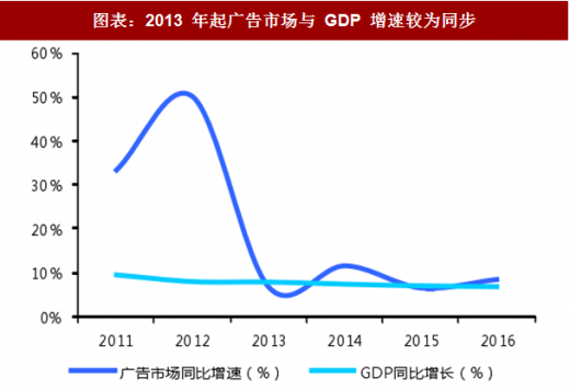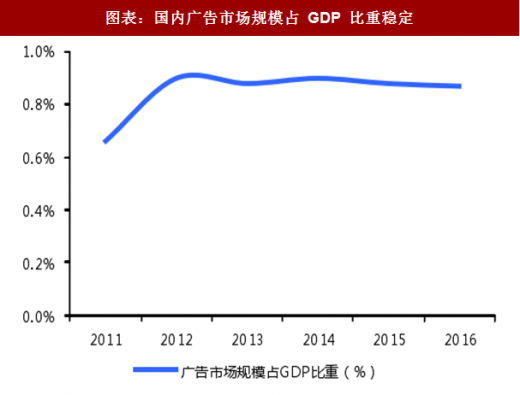 近五年来,广告市场规模占 gdp 比重稳定在 0.9%左右,表现出与宏观经济的高度相关性。我们有理由相信,经济的持续向好将有力推动广告行业的发展。