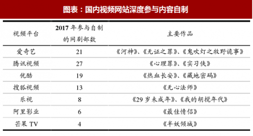 2017 年国内视频平台直接参与投拍的网络剧数量占所有上线网络剧的 33%。管虎、孔笙等知名导演加入网剧制作行列,新人导演表现抢眼。腾讯视频披露,2017 年自制投入和 2016 年相比增加 8 倍。其中自制剧投入涨幅 65%,自制综艺增长 140%,自制动漫增长 100%,自制纪录片增长 233%,自制核心团队的规模已超过 200 人。