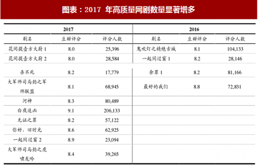 从豆瓣评分来看,2017 年豆瓣评分 8 分以上、评分人数 1 万人及以上的网络剧共有 10 部,相较 2016 年为 4 部,2015 年仅有 2 部,网剧口碑提升明显。从平均播放量来看,根据骨朵传媒的数据,2017 年单部网络剧平均播放量达到 5.53 亿次,而 2016 年仅为 2.56 亿次;播放量前十的头部网剧平均播放量达到 50 亿次,而 2016 年仅为 32 亿次,口碑提升同时,自制剧的关注度也大幅提高,为平台带来实实在在的流量红利。