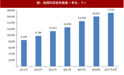 (3)民营医院领域在民营医院层面,我国民营医院是公立医院的有益补充。根据国家卫计委统计数据,截至2017 年6 月底,我国民营医院数量达到17,153 个,与2011 年相比增长超过100%。