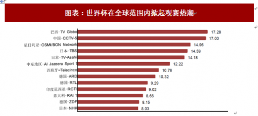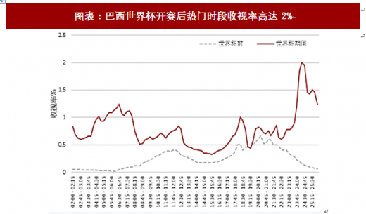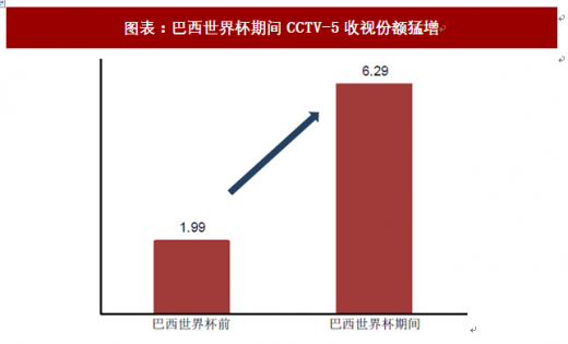 1.世界杯期间收视率飙升,成为全球球迷的狂欢节世界杯因其巨大的魅力,吸引着全球球迷参与其中,最直观的表现是世界杯期间相关电视节目收视率飙升。从我国电视端观赛情况来看,2014年巴西世界杯期间,cctv-1、cctv-5和cctv-5 全程了全部的64场比赛,短短一个月内超过7.9亿观众通过央视观看世界杯赛事和相关节目,累计收视时长超过34亿小时。在世界杯的拉动下,即便转播集中在凌晨时间段,主要转播频道cctv-5的收视率依旧获得明显飙升,收视排名从世界杯开赛前的第9名跃升至第1名,平均收视份额高达6.29%,而6月15日开赛后的第一个周日收视份额更是高达10.30%。
