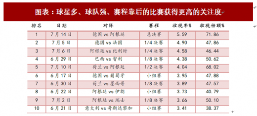 我们认为,世界杯之所以有巨大的影响力,来源于“球星 球队 赛程”三个方面的共同作用。从收视率较高的比赛场次来看,拥有大量球星的强队,同时赛程靠后的比赛通常能获得更大的关注度。其中德国对阵阿根廷的总决赛,收视率高达5.59%,收视份额达到了71.86%,在成都和沈阳的收视率更是达到8%以上。而相同赛程的比赛,拥有大量球星的场次获得的关注度更高,在1/4决赛中,德国和法国的比赛收视率高于其他三场,主要原因来自于两国球星云集,球队皆有夺冠经历,所以影响力更加强大。