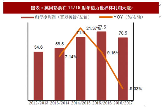对标欧洲,体育彩票销售量大,拥有广泛的群众基础,成为足球比赛必不可少的组成部分。在意大利,足球彩票占比高达92%,最经典的规则是“13奖/单式彩票”和“复式彩票”两种,主要针对国内联赛推出。在德国,彩票种类十分丰富,其中竞猜型足球彩票包括13场结果竞猜和45选6竞猜等玩法。在英国,唯一获得特许彩票运营商的卡梅洛特公司拥有多种体彩玩法,还曾推出欧洲杯主题的体育彩票,在2014/2015财年公司借世界杯拉动,净利润增速高达21.4%。