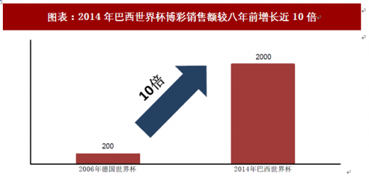 除了之外,博彩行业借世界杯的东风也能收获极好的销售收入。在2006年德国世界杯,全球可计算的博彩销售总额仅200亿欧元,而到了2014年巴西世界杯,该项数字就突破了2,000亿欧元,增长了近10倍之多。博彩行业的兴盛可以反映出世界杯在全球的巨大影响力和吸引力,在我国现行法律下,博彩行业是严厉禁止的,但竞猜型彩票有望获得较大发展机会。