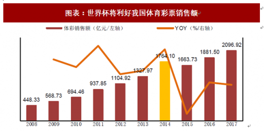 从2014年的经验来看,世界杯的举办有望使我国体育彩票销售额获得较大幅度的增长。从2014年巴西世界杯来看,当年体彩销售额增速达到30%以上,近两年随着彩票市场向好,18年世界杯期间体彩销售额有望再获突破式增长。建议重点关注中体产业,鸿博股份,天音控股等与彩票业务相关的公司。