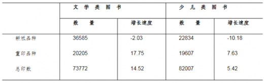 2017年,全国出版文学类图书7.4亿册,较2016年增加1.0亿册,增长14.5%,在22个图书类别中增幅名列前茅;文学类图书年度累计印数超过100万册的有7种,增加2种。全国出版少儿图书8.2亿册,增长5.4%;年度累计印数超过100万册的少儿图书有18种,增加13种;50万册及以上的80种,增加55种,其中本土原创图书48种,占60.0%。年度单品种印数超过100万册的本土原创文学、少儿类图书有18种,较2016年翻番。其中,《红岩》《没头脑和不高兴》《狼王梦》《草房子》等优秀作品历经数十年岁月沉淀,依然畅销不衰;“米小圈上学记”系列异军突起,12种上榜。