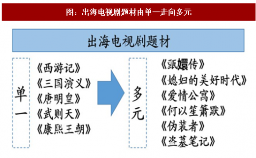 按电视剧题材、播放渠道来看,出口的电视剧题材由单一走向多元,港澳台、东南亚、日韩逐步成为播出中国内容最重要的三大市场。1986 版《西游记》是最早成功走向海外市场的国产剧。1994 年,《三国演义》在日本也引起轰动,1996 年在美国国际频道播出。随后,《唐明皇》、《武则天》、《康熙王朝》等一大批历史题材电视剧也风行东南亚地区,均在当地创下了高收视率。