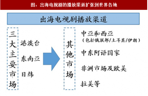 近些年,《汉武大帝》、《孝庄秘史》、《大宅门》、《还珠格格》、《乔家大院》、《金婚》等一大批电视剧已经走向世界各地。其中,《甄嬛传》登陆美国 hbo 电视台,《媳妇的美好时代》在肯尼亚掀起收视热潮。在过去 20 多年的发展中,播放中国节目的海外市场主要包括:港澳台、东南亚、日韩、中亚和西亚(包括俄联邦、土耳其、伊朗)、中东阿语国家、非洲市场及欧美、拉美等地区的华语频道。由于地缘和文化的接近,港澳台、东南亚、日韩是播出中国内容最重要的三大市场。