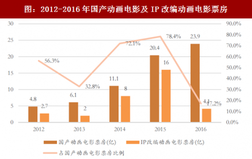ip改编动画大电影,助力动画电影市场票房逐年走高。动画电影市场对整个电影市场票房起到显著的拉动作用,如《十万个冷笑话》、《西游记之大圣归来》等ip改编作品为动画电影市场打了一剂强心针。