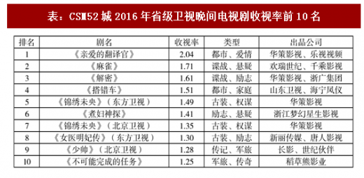 2015年,电视剧市场的潮流是女性、古装、传奇剧。到了2016年,都市、谍战、古装“三雄并立”,成为占据电视荧屏的主力军,并以ip剧(ip剧则是指将有一定受众基础的原创文学、游戏、动漫等进行二次创作改编而成的影视剧)作为主打。根据csm52城2016年省级卫视晚间电视剧收视率前10名,都市爱情剧《亲爱的翻译官》拔得头筹,成为收视冠军。谍战剧《麻雀》《解密》紧随其后,占据第2、3名。而多部古装大戏,如《锦绣未央》《女医明妃传》等也获得了较好的收视率,成功挤进晚间电视剧收视排行前10名。