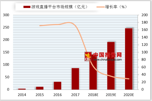 2018 年,游戏直播用户规模过往几年爆发式增长,2017 年游戏直播用户数达到 2.7 亿,预计 2020 年游戏直播用户规模达到 3.6 亿。预测游戏直播行业 2018年市场规模达到 141 亿元。