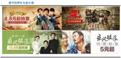 2017 年春节档预售期间,《大闹天竺》在猫眼上全面开启了 9.9 元,淘票票限时 8.8 元的抢票活动。《西游伏妖篇》主打淘票票的 8.8 元,猫眼 9.9 元辅助推进。《功夫瑜伽》有淘票票 8.8 元,百度糯米 6.6 元的加持。而《乘风破浪》则是开启淘票票 12.8 元,甚至在格瓦拉还推出了 5 元观影。目前上映第四天,各大售票 app 上仍然有几部电影 8.8元、15.8 元的优惠活动。