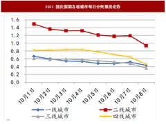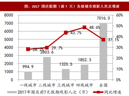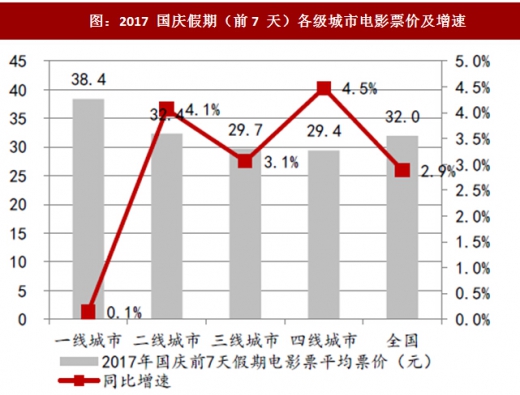 进一步拆分来看,票房的增长主要因观影人次的增长带来,而各级城市的平均票价有不同程度的小幅增长。观影人次方面,今年国庆假期一、二线城市分别同比口径增长28.2%和29.7%,三、四线城市分别同比口径增长43.7%和48.6%。我们分析,2017 年全国整体的影院渠道继续下沉态势,影院扩张继续带动放映场次的增加,预期全年影院的扩张增速将落在20%~25%的区间;其次,今年国庆档我们估计低层级城市的票补力度大于一、二线城市,带来三、四线城市更多的观影人次;且一二线城市国庆假期出境游的火爆也分流了部分流量。