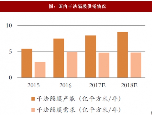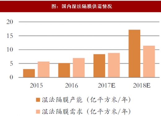 根据中国报告网的统计和广证恒生的整理,我国现有隔膜产能超过26亿平方米,而2017年上半年国内锂电池隔膜产量仅为6亿平方米。国内干法隔膜产能已经远超需求,产能过剩问题严重。国内湿法产能预计到2017年年底基本匹配湿法隔膜需求;而根据湿法在建产能统计,国内湿法隔膜产能预计在2018年下半年迎来产能的集中释放,将显著超过实际需求量。总体而言,产能过剩或将在近两年成为隔膜行业的大概率事件。