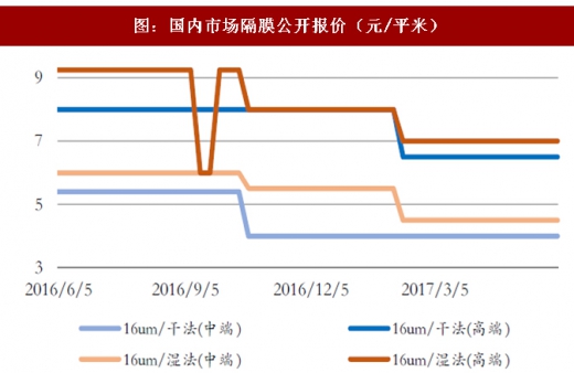 产能过剩带来的竞争加剧进一步促使国内隔膜产品价格下跌。根据中国化学与物理电源协会提供的国内隔膜公开报价,2017年以来各种档次隔膜产品的价格均有所下降,其中中端干法隔膜的当前价格相对2016年同期降幅最大,达26%;高端湿法和干法隔膜降幅较小。在隔膜整体降价的大趋势下,无论湿法还是干法工艺,低端隔膜将被逐步淘汰出市场,综合性能优异的隔膜产品才能占据稳固的市场空间。