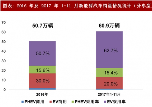 今年以来,由于商用车补贴大幅度退坡,我国新能源车市场的增量迅速由商用车切换至乘用车。据真锂研究的统计,前 7 个月,、商用车和专用车的销售占比分别为 82.6%,7.8%和 9.6%,较 2016 年的份额分别增加 20.7、-18.5 和-2.2 个百分点。由于乘用车和专用车对电池的能量比要求更高,这两类车型使用的电池以三元和锰系为主,商用车则出于安全性的考虑以铁锂电池为主,安全性能更高、能量密度更低的钛酸锂电池也有所应用。受此影响,三元/锰系电池的出货量占比在今年前 11 月份累计达到 52.71%,铁锂电池和钛酸锂电池的占比分别为 45.89%和 1.41%,较2016 年之前的电池出货结构发生了根本性的变化。