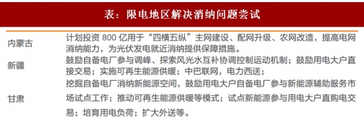 2016年12月,国家能源局发布《太阳能利用“十三五”规划》,谈及解决限电地区消纳问题,一方面要在靠近特高压外送基地的地区建设再生能源发电基站;另一方面,列示了在建和建设可行性在研的特高压项目,其中新疆、内蒙古、甘肃、宁夏、山西将有多条特高压陆续投运,青海、内蒙将有多条特高压开建,将缓解西北地区电力外送能力不足问题。