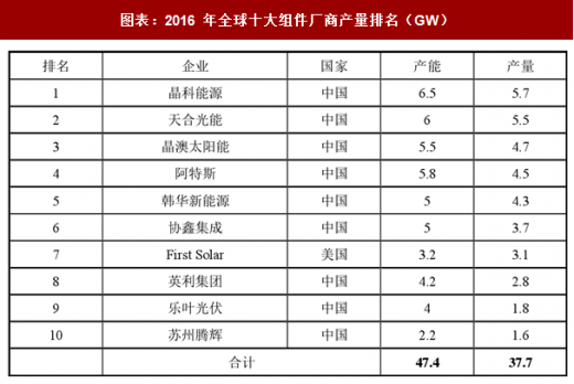 我国是组件产量大国,从全球格局来看,占绝对优势。2016 年全球前十大组件厂商中,中国企业占据九个位置。全年总产能达到 44.2gw,总产量达到34.6gw。