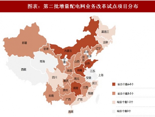 2016年 11 月 27 日,国家发改委、国家能源局联合发布了《规范开展增量配电业务改革试点的通知》,随文公布了《增量配电业务改革试点名单(第一批)》共 106 个增量配网试点项目;2017 年 11 月 21 日,两部委发布《增量配电业务改革试点名单(第二批)》共 89 个增量配网试点项目。两批项目明细见于附录 v。前两批试点项目在全国各省的分布如图所示,已实现了试点项目在西藏以外的全国大多数地区的覆盖。