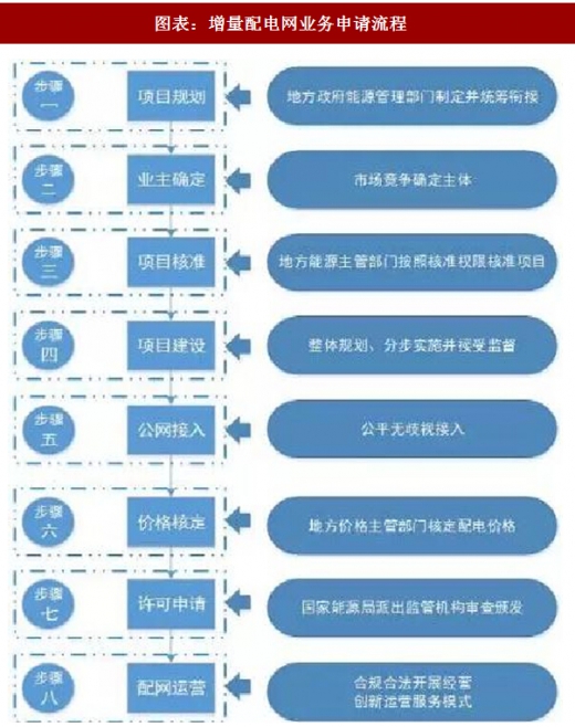 增量配电业务项目的管理流程分为 8 个步骤:项目规划、业主确定、项目核准、项目建设、公网接入、价格核定、许可申请、配电运营,具体如图所示。