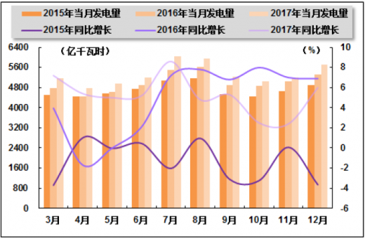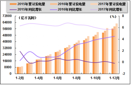 表:2016年12月-2017年12月水电发电量及同比增长情况