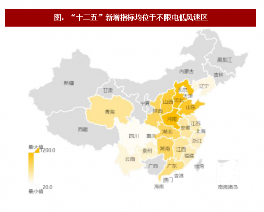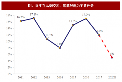 为应对行业结构性矛盾,局提出2020年我国弃风率降至5%以下的目标。在装机上,政策引导行业进行以下调整:(1)限电率超过20%地区,作为红色预警区域,着重于消纳而不再核准和新建项目;(2)“十三五”风电建设规模主要集中于中东部及南部地区,西北地区基本无新增指标;(3)推动分散式风电及海上风电项目,由于适合中东部地区,增量将主要体现在非限电区域。