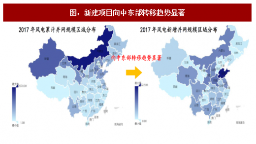 从2017年装机来看,西北部地区集中式建设放缓,大量项目向中东部及南部地区转移。但由于不同于中东部地区风资源分散,风况条件复杂,近半地区连片集中开发模式难以适用,分散式开发更可行。因此,低风速区发展离不开分散式项目的加速建设。