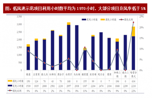 图:低风速示范项目利用小时数平均为1970小时,大部分项目弃风率低于5%
