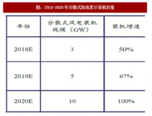 参照分布式、天然气装机规模发展规律,我们预计到2020年,中国分散式风电装机将达到20gw,每年新增分散式风电装机规模增速为100%以上,2018-2020年分散式风电新增装机规模依次为3gw、5gw、10gw。