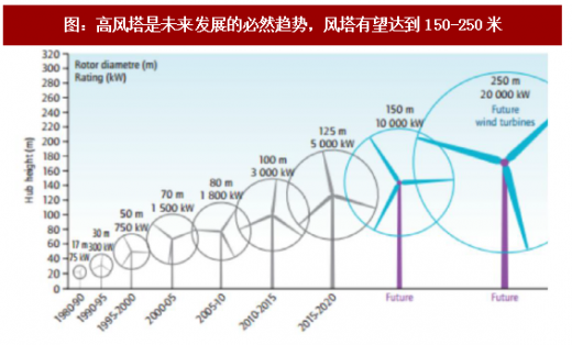 塔筒为风场基础而又关键的零部件,是风力发电的塔杆,支撑风电整机工作、吸收机组震动。一般情况下,高度越高,风资源越好。在低风速区,充分利用风资源的有效手段之一,即是提高风塔高度。风塔加高对其品质及建设工艺提出更高要求。图:高风塔是未来发展的必然趋势,风塔有望达到150-250米