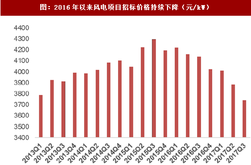 图:2016年以来风电项目招标价格持续下降(元/kw)