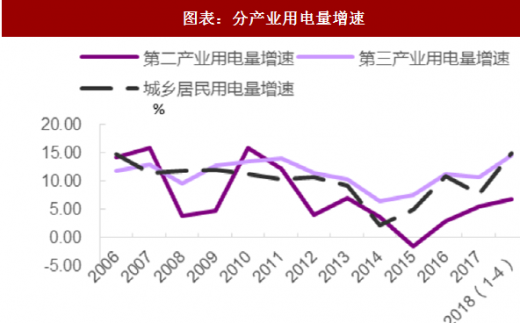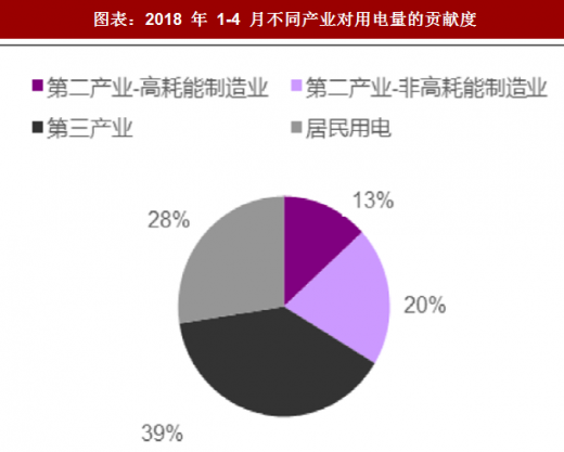1-4 月,第一产业、第二产业、第三产业和用电占比分别为 1%、68%、16%和 15%,用电量增速分别为 11%、6.9%、14.6%和 15%,第三产业和 居民用电增速明显高于第二产业,另外,从第二产业用电构成来看,占比 42%的高耗能制造业 1-4 月的用电增速仅为 3.8%,对 1-4 月全国用电量的增量贡 献仅为 12%,而第三产业和居民用电贡献了增量的 62%。因此下半年,固 定资产投资增速下滑更多的直接冲击高耗能制造业用电量,但由于其对用电 量增量的贡献度已经较低,对整体社会用电量的冲击将会明显减弱,预计下 半年用电需求仍然维持在高位,全年用电量增速或高于中电联预测的5.5%。
