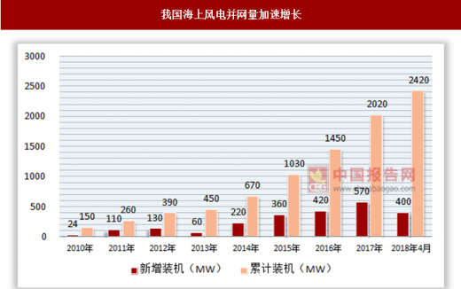 2015年开始,我国装机量逐年走高,开启了海上风电的新时期。截止到2018年4月累计装机达到了2420mw。