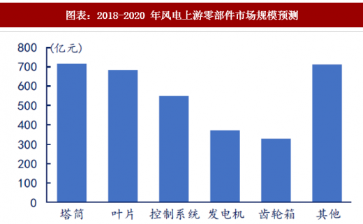 风电回暖带来市场规模可观。随着市场回暖,新增装机容量的释放逐步带动零部件市场的增长。根据能源局 2017 年发布的《2017-2020 年风电新增建设规模方案》,2018-2020 年全国新增建设规模合计约 80gw。目前风电场平均单位造价区间约为 7000-7500 元/千瓦。我们按照 7000 元/千瓦计算,风机机组成本约 4200 元/千瓦(占比接近 60%),结合 2016 年直驱机型 37.4%占比及不同机型的成本结构,估算出 2018-2020 年塔筒、叶片的市场总规模分别超过、接近 700 亿元级别,控制系统、发电机、齿轮箱紧随其后。