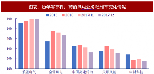 上游产品对原材料价格敏感度高。2017 年下半年以来,与风电相关的原材料大宗商品(、环氧树脂、等)涨势迅猛,直接冲击上游零部件厂商盈利水平,除部分技术优势明显的企业外,各子板块业务的毛利率均呈现出下移趋势。