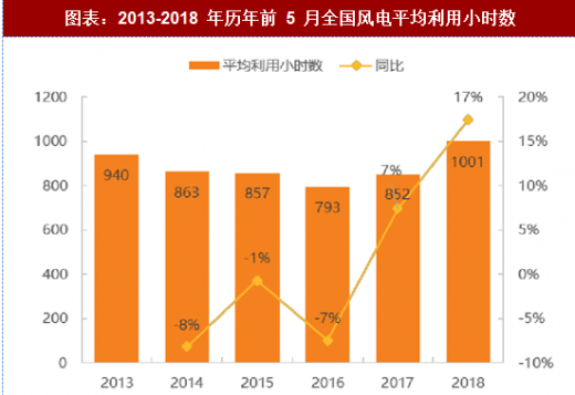 1-5 月全国并网风电设备平均利用小时为 1001 小时,比上年同期增加 149 小时。随着弃风限电情况改善,风电预警的“红六省”变为“红三省”,风电平均利用小时数持续提升。根据近日新疆自治区发改委公布的数据,1-5 月份自治区风电设备平均利用小时数为813小时,比去年同期增加109小时;弃风电量59.3亿千瓦时,同比下降约1.8%,弃风率 29.4%,同比下降 3.8 个百分点。在持续实现弃风电量和弃风率“双降”的情况下,新疆有望尽快实现解禁。