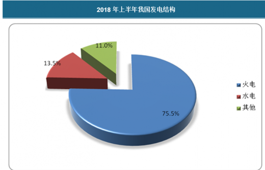 从我国发电结构来看,2018年上半年火电仍然占据的绝对的比例,达到了75.5%,水电占比约为13.5%,其他占比为11%。