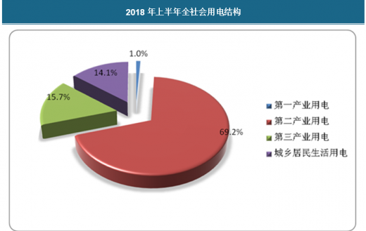从我国用电结构来看,第二产业占据的绝对需求量,2018年上半年第二产业共用电22336亿千瓦时,工业用电占比第二产业中的98.4%。